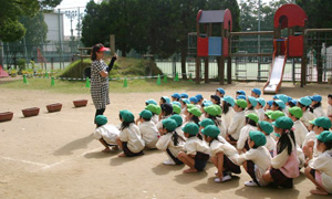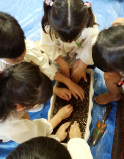 学校や幼稚園などに出向き、種播きや幼苗の花の特徴、成長過程、土のリサイクル、世話の仕方などを絵に描いて説明し指導をします。