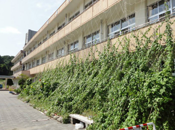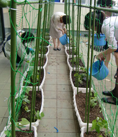 夏休みの後から10月ごろまで咲き続ける西洋朝顔の3種類、その他、アサリナ、フウセンカズラ、希望によりさやいんげんやスイートピーなどツル性の草花を絡ませます。大きいものでは横幅12~13m、高さは校舎の3階まで伸ばし遮光効果を図っています。