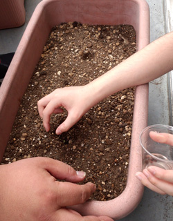 翌年の春に咲く、ビオラやパンジー(種2,000、苗1,850 2013年秋)などの種播きや2、3㎝に生育した幼苗の移植作業、その他草花の種播き、チューリップ、ムスカリ、ハーブ類など球根の植え付けを行います。