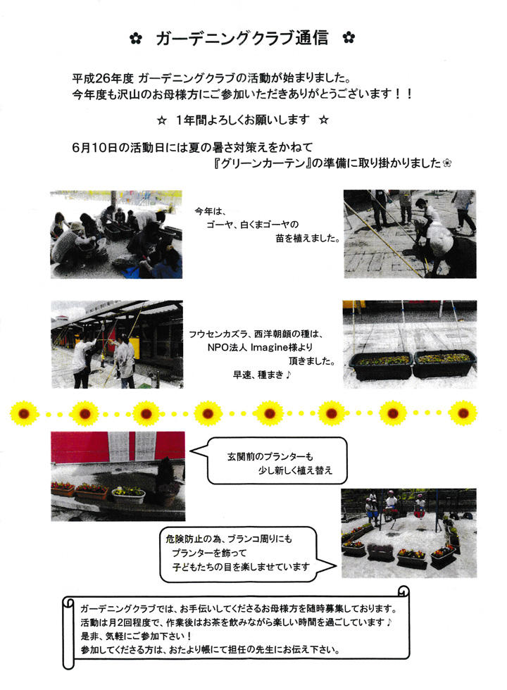春には、お花のグリーンカーテンつくり(数種類の西洋朝顔、その他ツル性のお花など)をし、その他、ヒマワリやコスモスなどの種播きをします。
