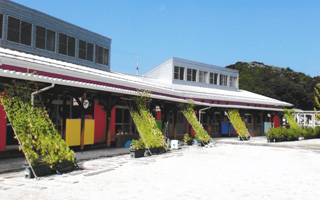 ベランダの窓にカーテンを作ることが困難な場合は、アーチ型の支柱を利用し5m位のお花のトンネルを作り園児たちの楽しみの場所になっています。